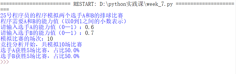 from random import random def printIntro(): print("25号程序员的程序模拟两个选手A和B的排球比赛") print("程序需要A和B的能力值(以0到1之间的小数表示)") def getInputs(): a=eval(input("请输入选手A的能力值(0—1):")) b=eval(input("请输入选手B的能力值(0—1):")) n=eval(input("模拟比赛的场次:")) return a,b,n def simNGames(n,probA,probB): winsA,winsB=0,0 for i in range(n): scoreA,scoreB=simOneGame(probA,probB) if scoreA>scoreB: winsA+=1 else: winsB+=1 return winsA,winsB def gameOver1(a,b): return (a>=25 and a-b>2) or (b>=25 and b-a>2) def gameOver2(a,b): return (a>=15 and a-b>2) or (b>=15 and b-a>2) def simOneGame(probA,probB): for i in range (5): winsA,winsB=0,0 scoreA,scoreB=0,0 serving="A" while not gameOver1(scoreA,scoreB): if serving=="A": if random()<probA: scoreA+=1 else: scoreB+=1 serving="B" else: if random()<probB: scoreB+=1 else: serving="A" scoreA+=1 if scoreA>scoreB: winsA+=1 else: winsB+=1 if winsA==3 or winsB==3: break if winsA==2 and winsB==2: simtowGame(probA,probB) return winsA,winsB def simtowGame(probA,probB): for i in range (1): scoreA,scoreB=0,0 serving="A" while not gameOver2(scoreA,scoreB): if serving=="A": if random()<probA: scoreA+=1 else: scoreB+=1 serving="B" else: if random()<probB: scoreB+=1 else: serving="A" scoreA+=1 return scoreA,scoreB def printSummary(winsA,winsB): n=winsA+winsB print("竞技分析开始,共模拟{}场比赛".format(n)) print("选手A获胜{}场比赛,占比{:0.1%}".format(winsA,winsA/n)) print("选手B获胜{}场比赛,占比{:0.1%}".format(winsB,winsB/n)) def main(): printIntro() probA,probB,n=getInputs() winsA,winsB=simNGames(n,probA,probB) printSummary(winsA,winsB) main()