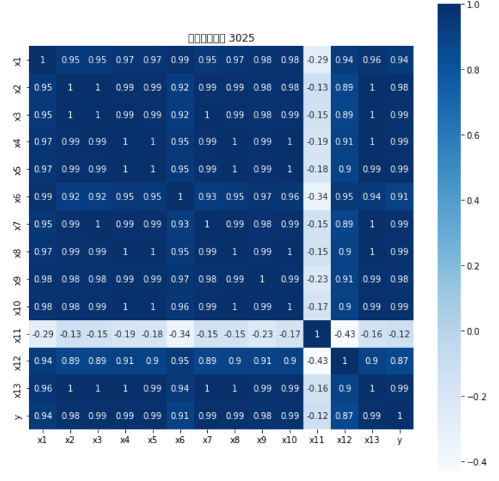 import numpy as np import pandas as pd inputfile = 'C://Users//Administrator//Desktop//data.csv' # 输入的数据文件 data = pd.read_csv(inputfile) # 读取数据 # 描述性统计分析 description = [data.min(), data.max(), data.mean(), data.std()] # 依次计算最小值、最大值、均值、标准差 description = pd.DataFrame(description, index = ['Min', 'Max', 'Mean', 'STD']).T # 将结果存入数据框 print('描述性统计结果:\n',np.round(description, 2)) # 保留两位小数 # 代码6-2 # 相关性分析 corr = data.corr(method = 'pearson') # 计算相关系数矩阵 print('相关系数矩阵为:\n',np.round(corr, 2)) # 保留两位小数 # 代码6-3 # 绘制热力图 import matplotlib.pyplot as plt import seaborn as sns plt.subplots(figsize=(10, 10)) # 设置画面大小 sns.heatmap(corr, annot=True, vmax=1, square=True, cmap="Blues") plt.title('相关性热力图 3025') plt.show() plt.close