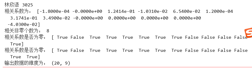 print('林欣语 3025') print('相关系数为:',np.round(lasso.coef_,5)) print('相关非零个数为:',np.sum(lasso.coef_ != 0)) mask =lasso.coef_ != 0 print('相关系数是否为零:',mask) mask = np.append(mask,True) print('相关系数是否为零:',mask) outputfile ='C://Users//Administrator//Desktop//tmp//new_reg_data3.csv' new_reg_data = data.iloc[:,mask] new_reg_data.to_csv(outputfile) print('输出数据的维度为:',new_reg_data.shape)