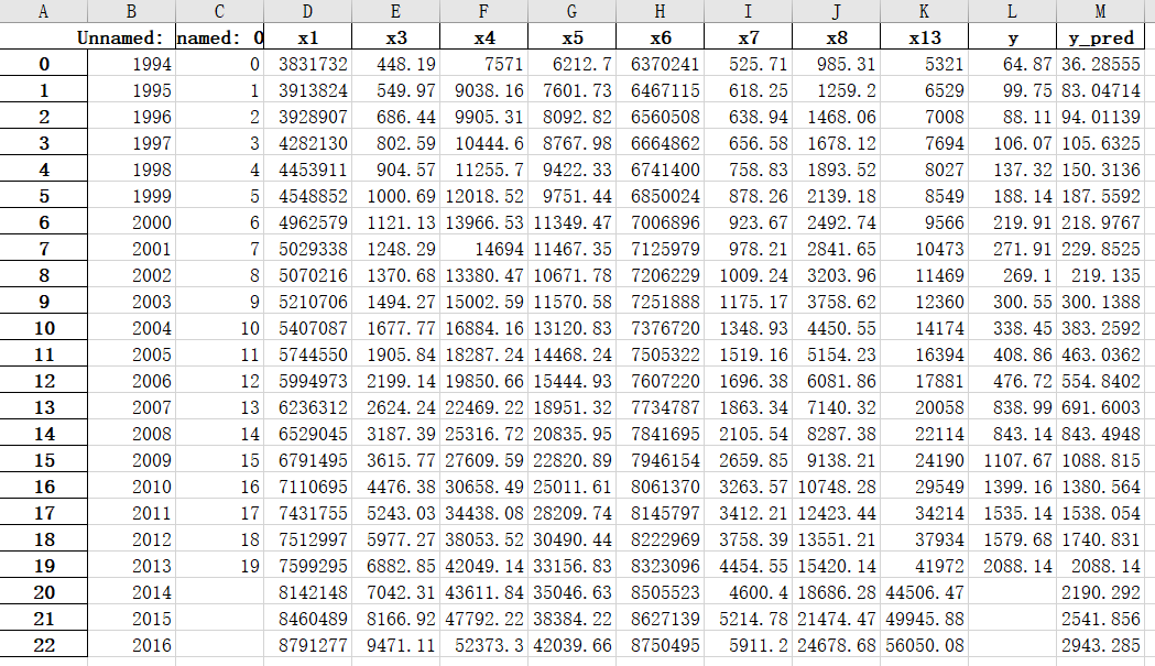 import numpy as np import pandas as pd from sklearn.linear_model import Lasso inputfile ='C://Users//Administrator//Desktop//data.csv' data = pd.read_csv(inputfile) lasso = Lasso(1000) lasso.fit(data.iloc[:,0:13],data['y'])