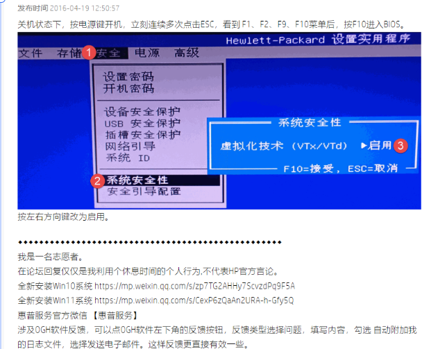 在主机关闭的情况下插上U盘,下面要修改boot order,我多方参考,推荐惠普社区以及下面这个“惠普电脑设置U盘启动方法”的视频。