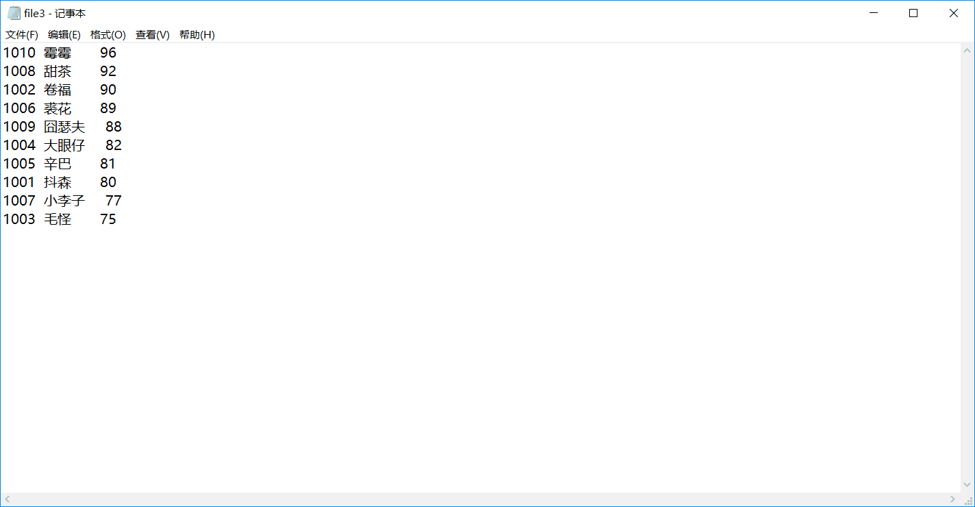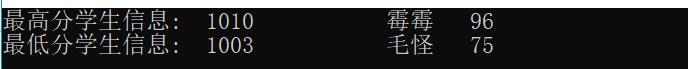 // 从文本文件file1.dat中读取数据,找出最高分和最低分学生信息,并输出在屏幕上 #include <stdio.h> #include <stdlib.h> #define N 10 // 定义一个结构体类型STU typedef struct student { int num; char name[20]; int score; }STU; int main() { STU st, stmax, stmin; int i; FILE *fp; // 以只读文本方式打开文件file1.dat fp = fopen("file1.dat", "r"); if( !fp ) { // 如果打开失败,则输出错误提示信息,然后退出程序 printf("fail to open file1.dat\n"); exit(0); } stmax.score = 0; // 先假定最高分是0,后面如发现比当前最高分还高的分数,就更新最高分 stmin.score = 100; // 先假定最低分是100分,后面如发现比当前最低分更低的分数,就更新最低分 while( !feof(fp)) { fscanf(fp, "%d %s %d", &st.num, st.name, &st.score); // 从fp指定的文件中格式化读取一个学生信息 if(st.score > stmax.score) stmax = st; else if(st.score < stmin.score) stmin = st; } fclose(fp); printf("最高分学生信息: %5d%15s%5d\n", stmax.num, stmax.name, stmax.score); printf("最低分学生信息: %5d%15s%5d\n", stmin.num, stmin.name, stmin.score); return 0; } // 这是《C语言程序设计教程学习指导》「2.10 文件」中的实验,细微处做了微调 // 这个源代码没有考虑多个高分或多个低分的情形。