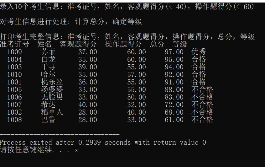 #include <stdio.h> #include <string.h> const int N = 10; // 定义结构体类型struct student,并定义其别名为STU typedef struct student { long int id; char name[20]; float objective; /*客观题得分*/ float subjective; /*操作题得分*/ float sum; char level[10]; }STU; // 函数声明 void input(STU s[], int n); void output(STU s[], int n); void process(STU s[], int n); int main() { STU stu[N]; printf("录入%d个考生信息: 准考证号,姓名,客观题得分(<=40),操作题得分(<=60)\n", N); input(stu, N); printf("\n对考生信息进行处理: 计算总分,确定等级\n"); process(stu, N); printf("\n打印考生完整信息: 准考证号,姓名,客观题得分,操作题得分,总分,等级\n"); output(stu, N); return 0; } // 从文本文件examinee.txt读入考生信息:准考证号,姓名,客观题得分,操作题得分 void input(STU s[], int n) { FILE *fin; fin=fopen("examinee.txt","r"); if(!fin) { printf("Failed to open file\n"); } int i; for(i=0;i<n;i++) { if(fscanf(fin,"%ld %s %f %f",&s[i].id,s[i].name,&s[i].objective,&s[i].subjective)==0) printf("读取错误!"); } fclose(fin); } // 输出考生完整信息: 准考证号,姓名,客观题得分,操作题得分,总分,等级 // 不仅输出到屏幕上,还写到文本文件result.txt中 void output(STU s[], int n) { int i; FILE *fout; fout=fopen("result.txt","w"); printf("准考证号 姓名 客观题得分 操作题得分 总分 等级\n"); fprintf(fout,"准考证号 姓名 客观题得分 操作题得分 总分 等级\n"); for(i=0;i<n;i++) { printf(" %-9ld%-10s%-13.2f%-10.2f%-7.2f%-8s\n",s[i].id,s[i].name,s[i].objective,s[i].subjective,s[i].sum,s[i].level); fprintf(fout," %-9ld %-10s%-13.2f%-10.2f%-7.2f%-8s\n",s[i].id,s[i].name,s[i].objective,s[i].subjective,s[i].sum,s[i].level); } fclose(fout); } // 对考生信息进行处理:计算总分,排序,确定等级 void process(STU s[], int n) { int i,j,k; int a1,a2; a1=(int)(N*0.1),a2=(int)(N*0.5); STU temp; for(i=0;i<n;i++) s[i].sum=s[i].objective+s[i].subjective; for(j=0;j<n-1;j++) { for(k=0;k<n-j-1;k++) { if(s[k].sum<s[k+1].sum) { temp=s[k]; s[k]=s[k+1]; s[k+1]=temp; } } } strcpy(s[0].level,"优秀" ); for(i=1;i<=4;i++){ strcpy(s[i].level,"合格"); } for(i=5;i<=9;i++){ strcpy(s[i].level,"不合格"); } }