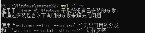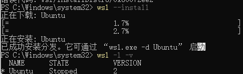 等待一会下载完成后,就可以再次输入wsl -l -v 看看是否出现如下图,则成功。