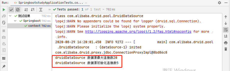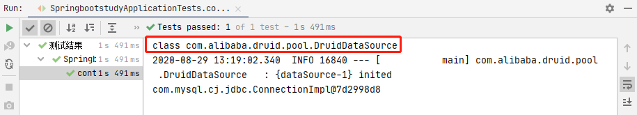 1 @SpringBootTest 2 class SpringbootstudyApplicationTests { 3 //DI注入数据源 4 @Autowired 5 DataSource dataSource; 6 7 @Test 8 void contextLoads() throws SQLException { 9 //看一下默认数据源 10 System.out.println(dataSource.getClass()); 11 //获取连接 12 Connection connection = dataSource.getConnection(); 13 System.out.println(connection); 14 15 DruidDataSource druidDataSource = (DruidDataSource) dataSource; 16 System.out.println("druidDataSource 数据源最大连接数"+druidDataSource.getMaxActive()); 17 System.out.println("druidDataSource 数据源初始化连接数"+druidDataSource.getInitialSize()); 18 //关闭连接 19 connection.close(); 20 } 21 22 }