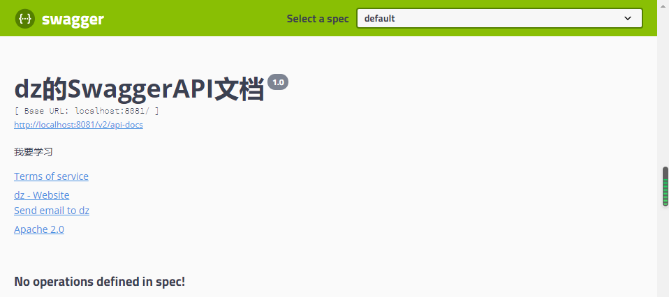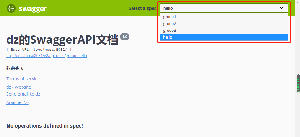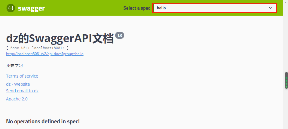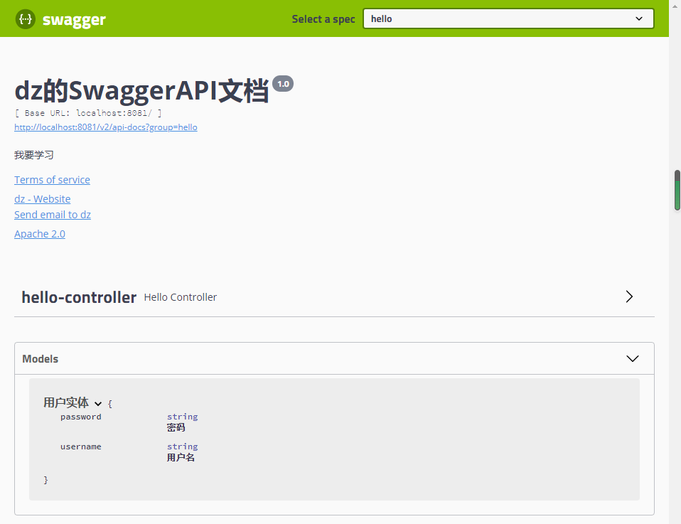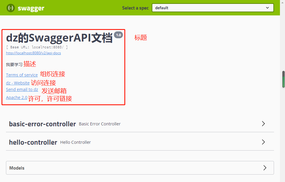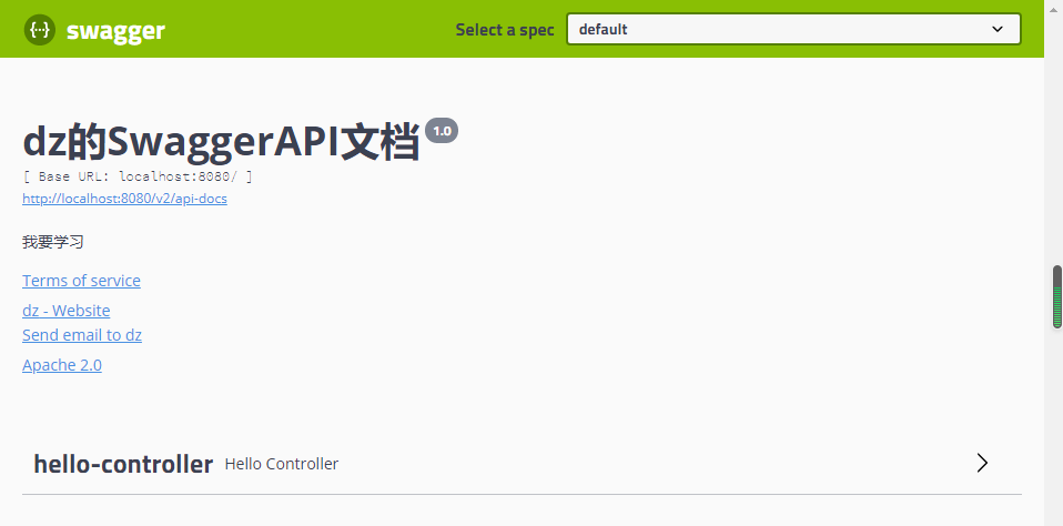 1 private ApiInfo apiInfo(){ 2 Contact contact = new Contact("dz", "https://www.cnblogs.com/lxzlovewyq/", "942142624@qq.com"); 3 return new ApiInfo( 4 "dz的SwaggerAPI文档", //标题 5 "我要学习", //描述 6 "1.0", //版本 7 "https://www.cnblogs.com/lxzlovewyq/", //组织连接 8 contact, //联系人信息 9 "Apache 2.0", //许可 10 "http://www.apache.org/licenses/LICENSE-2.0", //许可连接 11 new ArrayList()); //扩展 12 }