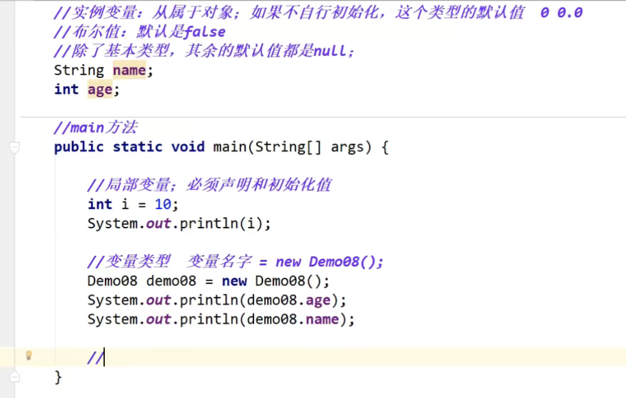 实例变量从属于对象,实例变量就是全局变量,数值类型如果不进行初始化,默认值是0;布尔值默认值是false。除了基本类型,其余类型默认值都是null。