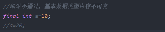 - 修饰的局部变量,只能赋值一次,可先声明后赋值