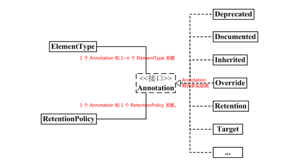 - 每1个Annotation对象,都会有唯一的RetentionPolicy,至于ElementType属性,则有 1~n个。