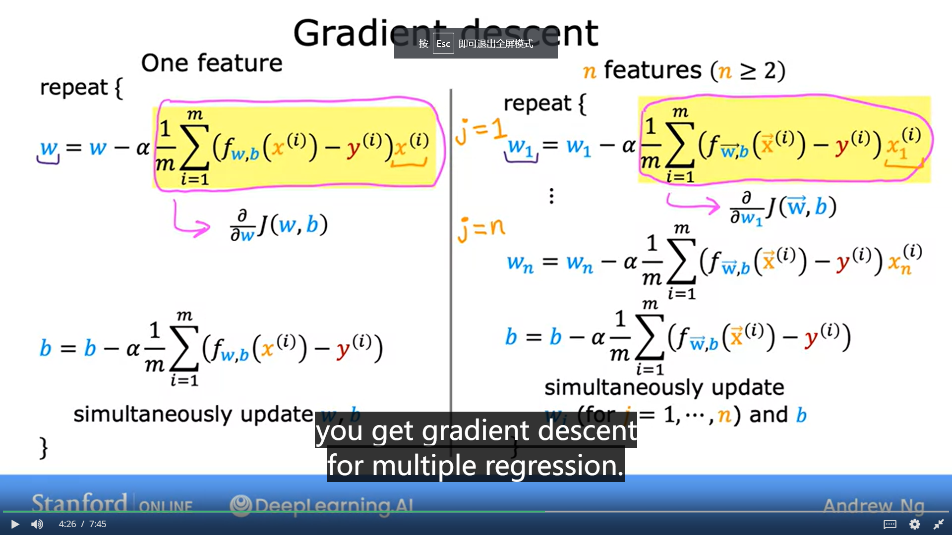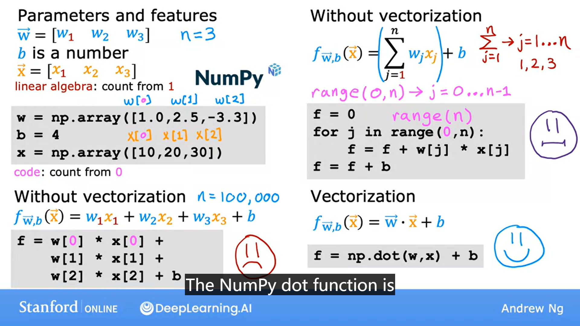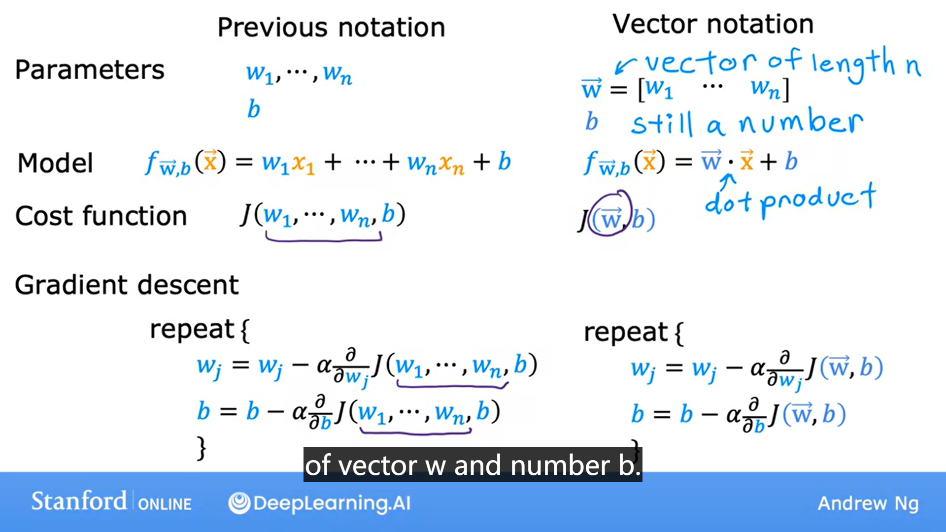 $f_{\vec{w},b}(\vec{x}) =\vec{W}\cdot\vec{X}+b=w_1x_1+w_2x_2+w_3x_3+...+...w_nx_n+b $