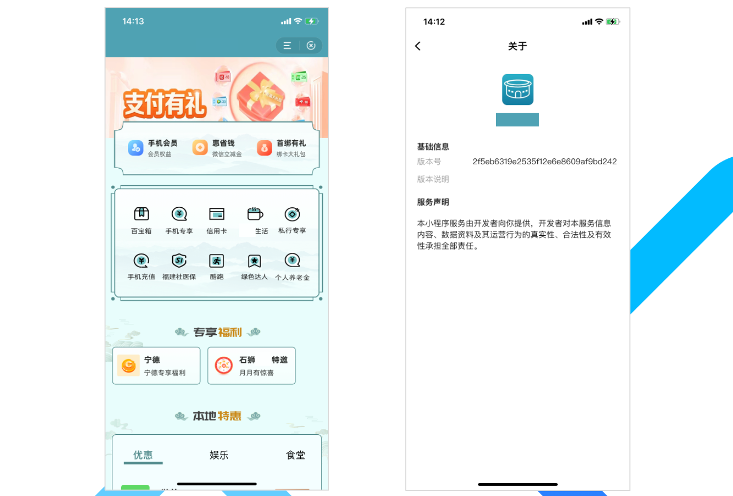 借助 FinClip 小程序容器在手机银行 App 内引入海量的内外部优质服务小程序,例如生活缴费、电影票订购、外卖等,结合自身的金融服务能力,打造特色化金融服务,且丰富 App 使用场景,真正实现借力他人,协同服务用户。现已上架首批本地优惠类的小程序在 App 中。
