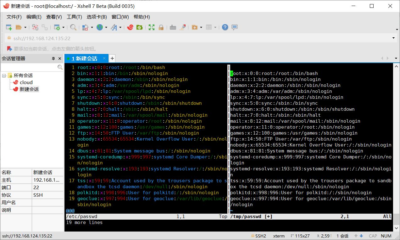 2.进入命令模式,输入:vsplit /etc/passwd打开/etc/passwd