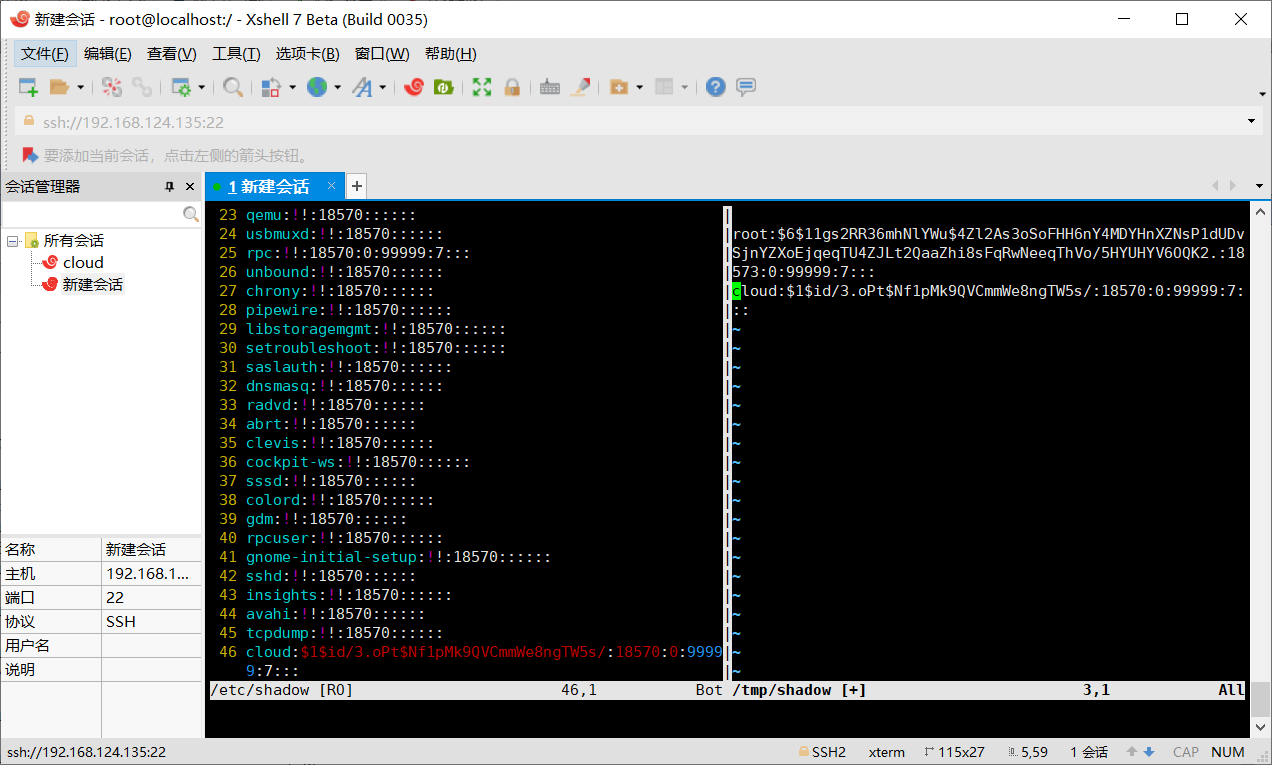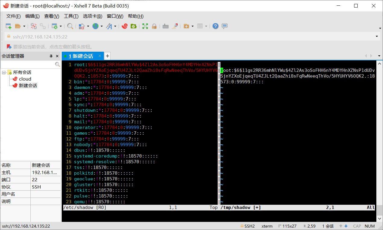 2.输入:vsplit /etc/shadow打开/etc/shadow