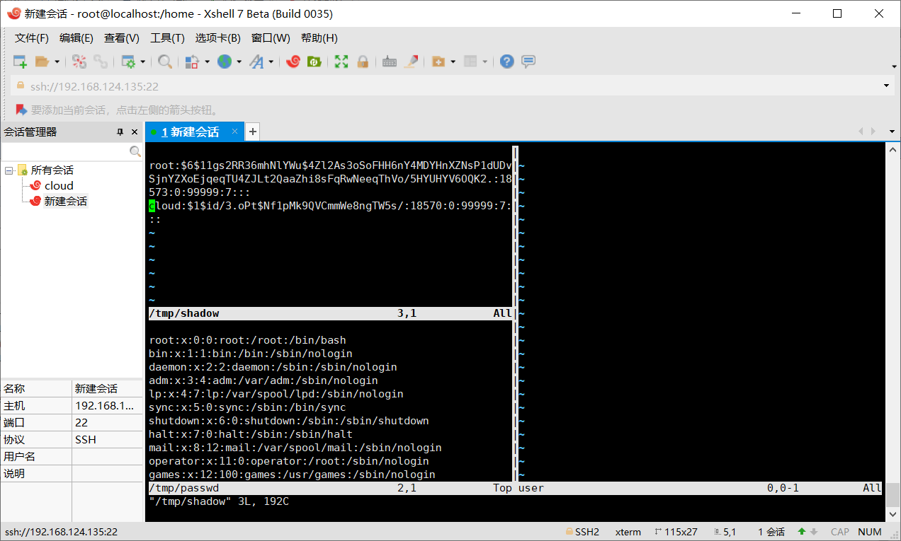 1.输入vim /tmp/shadow进入编辑器