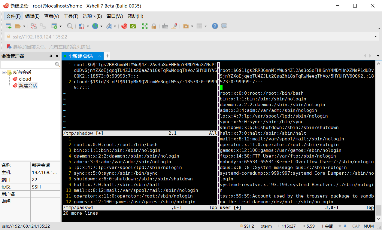3.输入:vsplit /tmp/passwd和:split /tmp/shadow打开/tmp/passwd和/tmp/shadow