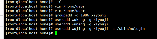 1.新建几个普通用户wukong,wuneng,wujing,他们都属于xiyouji的成员,其中wujing没有和系统交互的shell(没有和系统交互的shell就是无法登陆系统)