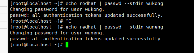 输入echo redhat | passwd --stdin wukong和echo redhat | passwd --stdin wuneng