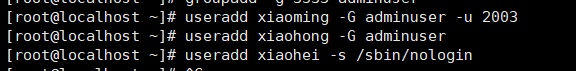 2.分别输入useradd xiaoming -G adminuser -u 2003和useradd xiaohong -G adminuser和useradd xiaohei -s /sbin/nologin创建