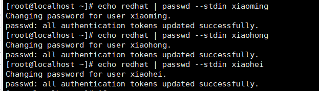 3.分别输入echo redhat | passwd --stdin xiaoming和echo redhat | passwd --stdin xiaohong和echo redhat | passwd --stdin xiaohei修改密码