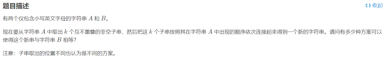 再拓展一下,如果选 k k k 个子序列呢?先考虑选 1 1 1 个子串,那就是不限制匹配多少个子串,然后你一定能把它拆成 k k k 个子序列,插板法一下。