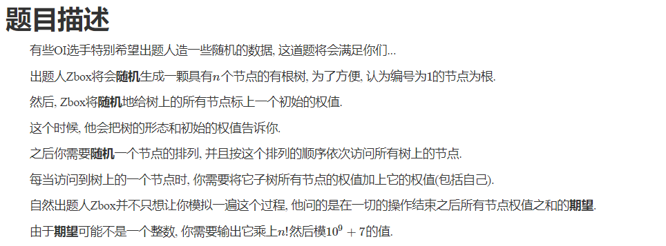 那么预处理每个点到根节点的路径,分别去计算每个点的答案。问题可以转换成给定一个序列 a a a,对于一个下标排列的每一项 k k k 进行操作 a k ∼ a n + = a k a_k \sim a_n +\!\!=a_k ak∼an+=ak,求所有全排列下 a n a_n an 的期望。
