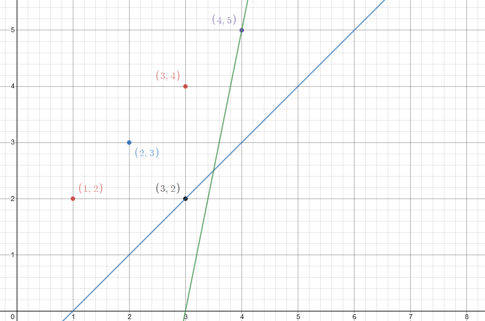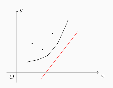 (x,y) 即为需要的点。而我们可以发现,有机会上位的点一定可以组成一个下凸包,即为相邻两个点的斜率是单调递增的,为什么呢?