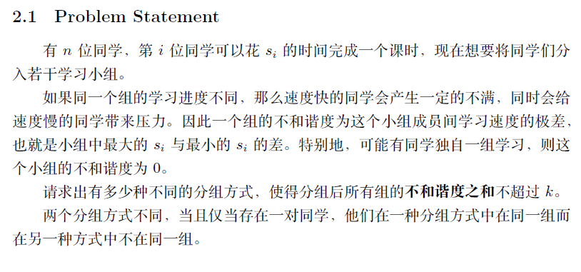 首先要确定关键字排序,当然是按 s i s_i si 排序了,那么同一组的人的极差就是第一个人和最后加进的人。那么正常的 dp 状态是 f i , j , k f_{i,j,k} fi,j,k 表示前 i i i 个人分成 j j j 组极差和为 k k k 的方案数,但是不能知道哪个组有没有结束,所以 j j j 那一维应该是有 j j j 组没有结束。那么转移为