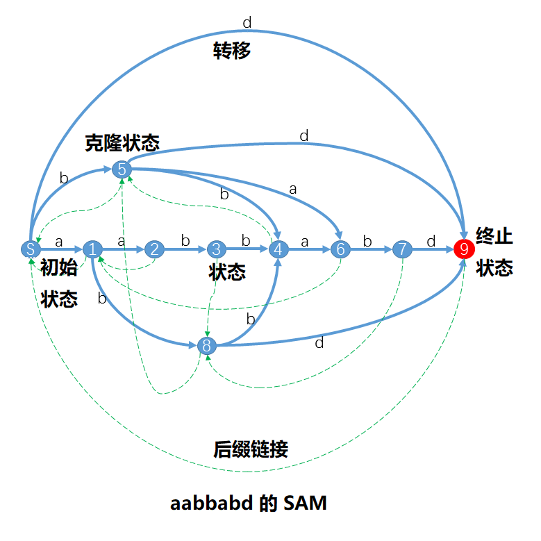 - SAM 是 DFA 确定性有限状态自动机,是一张 DAG 有向无环图。结点为 状态 ,边被为状态间的 转移。