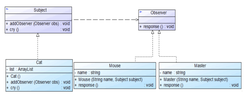 ① 观察者模式,分析:要有联动性,老鼠和主人的行为是被动的;考虑可扩展性,猫的叫声可能引起其他联动效应。