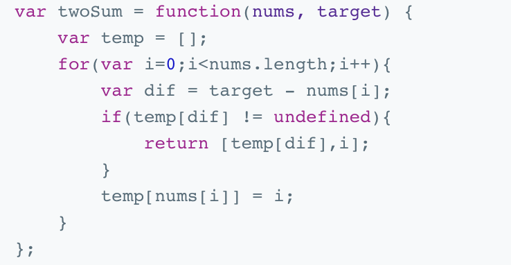 在暴力法中,内层循环查找差值很浪费时间,那么如何减少查询时间呢?利用数组就可以减少查询时间。使用一层循环,每遍历到一个元素就计算该元素与target 之间的差值diff,然后到以diff为下标到数组temp中寻找,如果temp[diff]有值,则返回两个元素在数组nums的下标,如果没有找到,则将当前元素存入数组temp中。