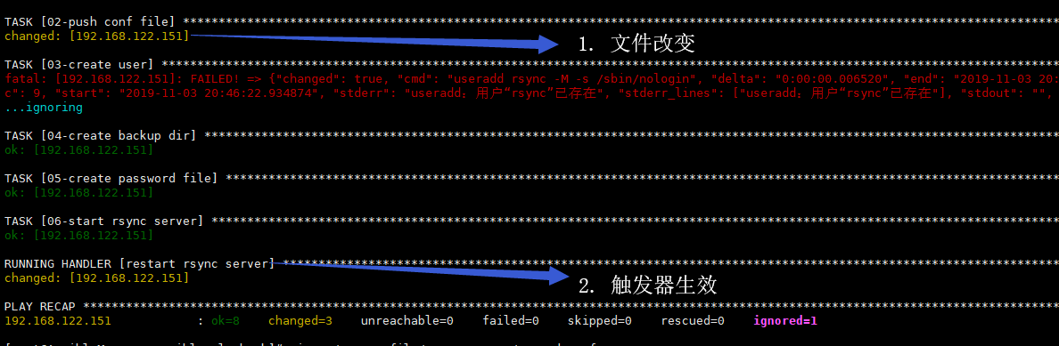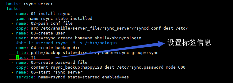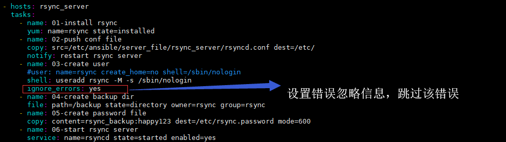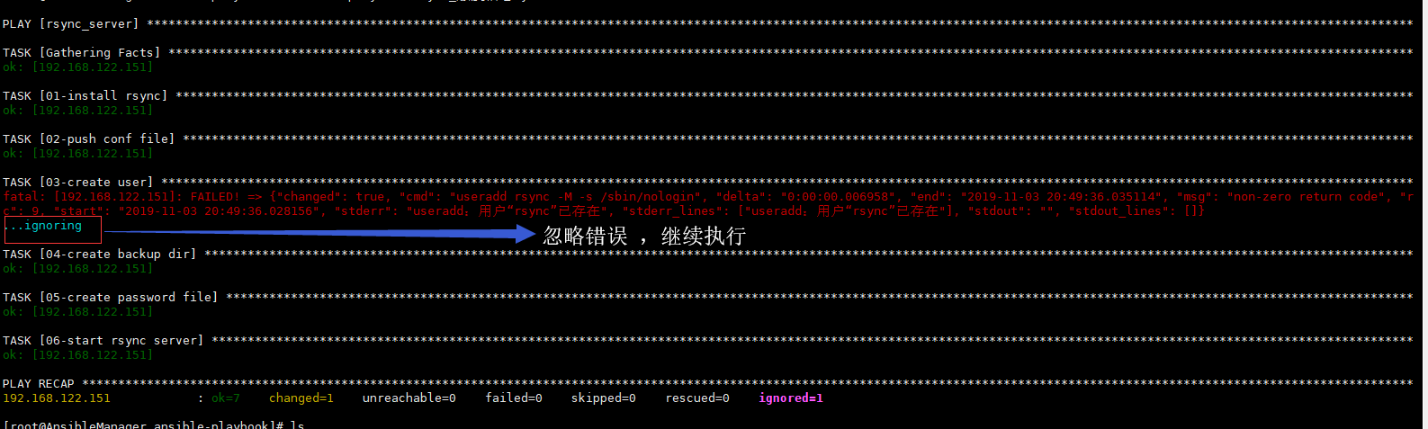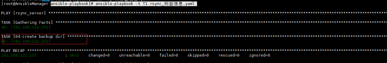ansible-playbook]# ansible-playbook -t T1 rsync_标签信息.yaml ansible-playbook]# ansible-playbook -tags=T1 rsync_标签信息.yaml ansible-playbook]# ansible-playbook --skip-tags=T1 rsync_标签信息.yaml ---- 跳过标签执行
