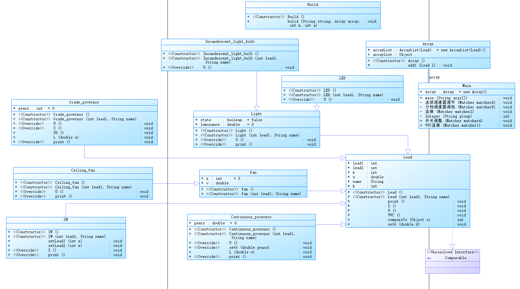 可以看出这次的程序有非常多的类,第一次的电路程序中只考虑一条串联电路,故电路中只有控制设备(开关,分档调速器,连续调速器),受控设备(灯啊,风扇啊)。这次的类都是元件设备,所以我先设计了一个Lead类作为所有电路元件的父类:包含了一个无参构造方法和一个有参构造方法,用于初始化对象。包括了两个引脚(虽然没怎么用上)、状态、电压、名字、优先级等属性。提供了输出方法(每个电器都需重写,有对应不同的输出方法)、设置电压方法等。