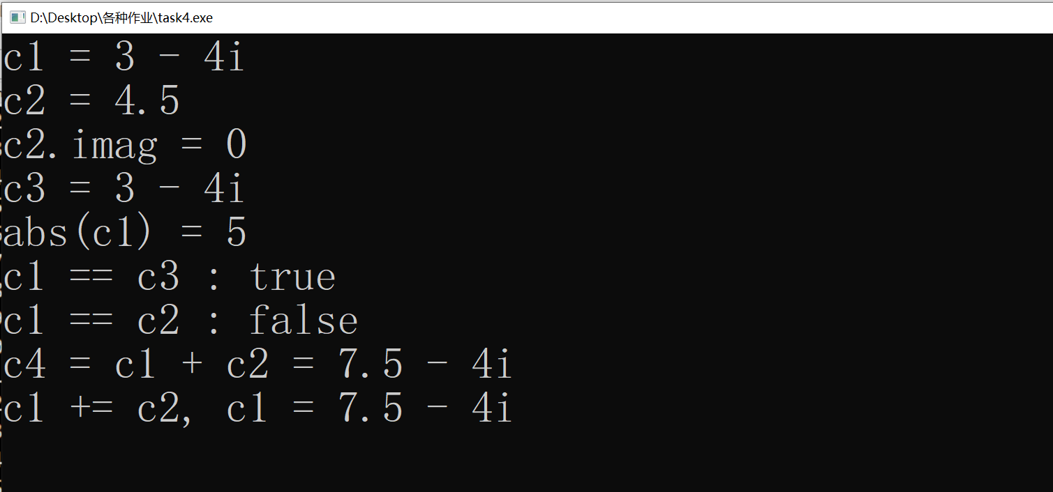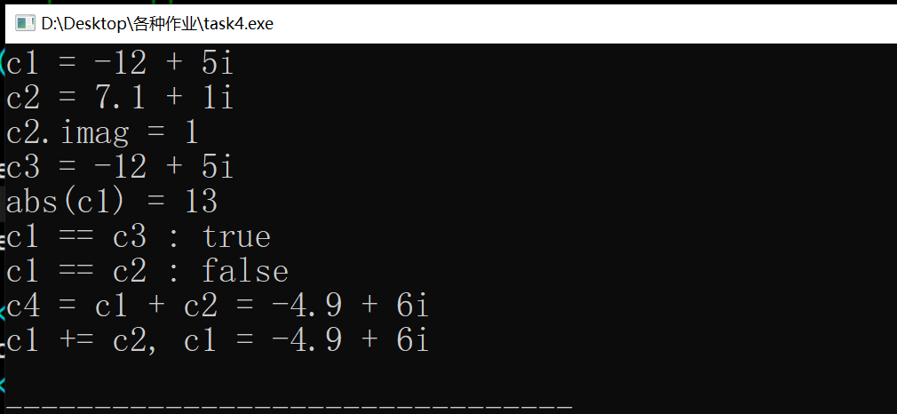 #include<iostream> #include<math.h> using namespace std; class Complex{ public: Complex (double x = 0, double y = 0) : real{x}, imag{y} {} Complex (const Complex &obj) : real{obj.real} , imag{obj.imag} {} double get_real() const { return real; } double get_imag() const { return imag; } void show() const { cout << real; if(imag > 0) cout << " + " << imag << "i"; else if(imag < 0) cout << " - " << -imag << "i"; } void add(const Complex &obj){ real += obj.get_real(); imag += obj.get_imag(); } friend Complex add(const Complex &a, const Complex &b){ return Complex(a.real + b.real, a.imag + b.imag); } friend bool is_equal(const Complex &a, const Complex &b){ return fabs(a.real - b.real) <= 1e-5 && fabs(a.imag - b.imag) <= 1e-5; } friend double abs(const Complex &obj){ return sqrt(obj.real * obj.real + obj.imag * obj.imag); } private: double real, imag; };