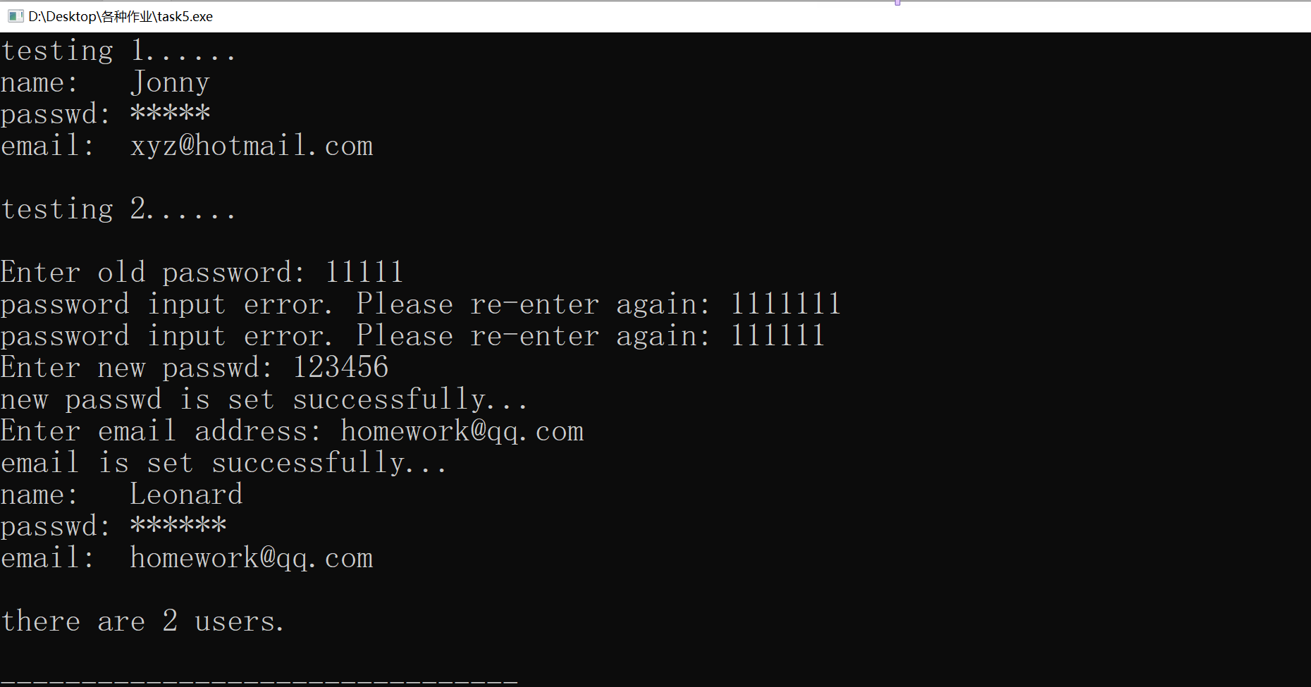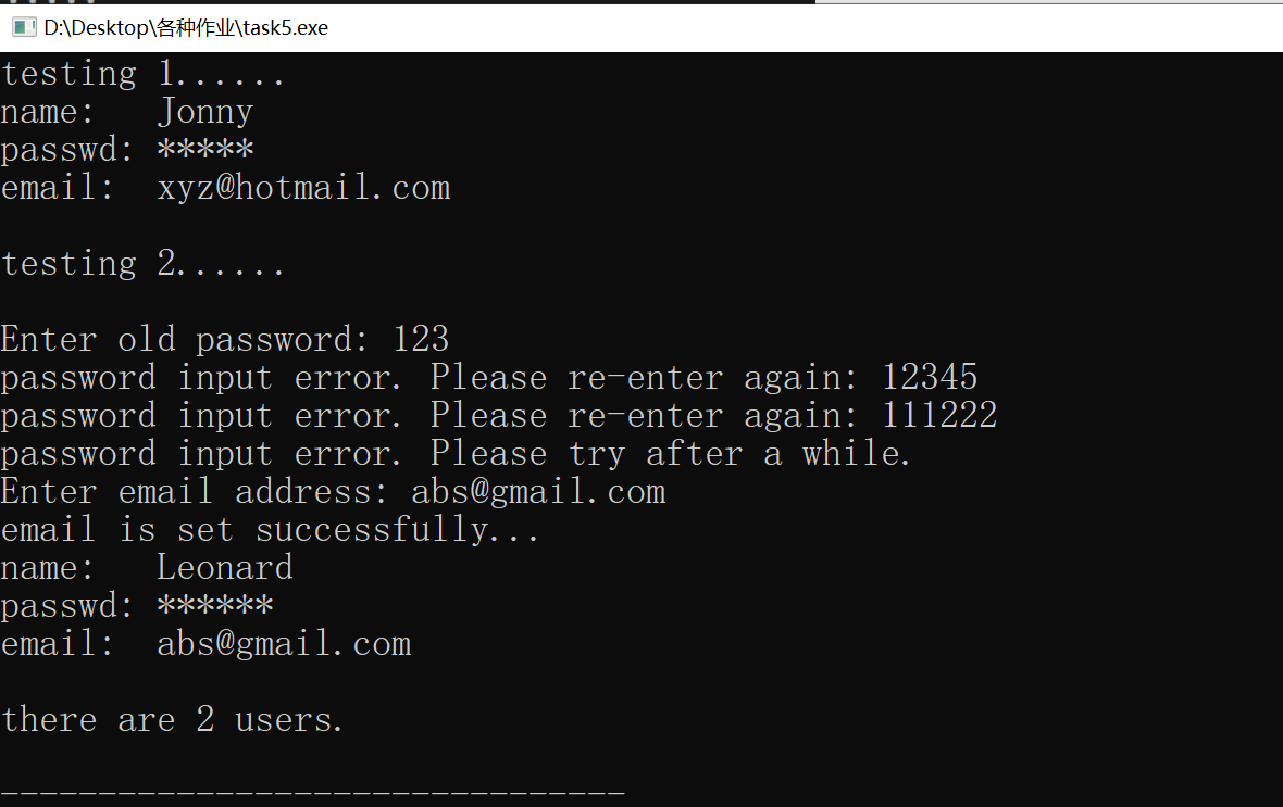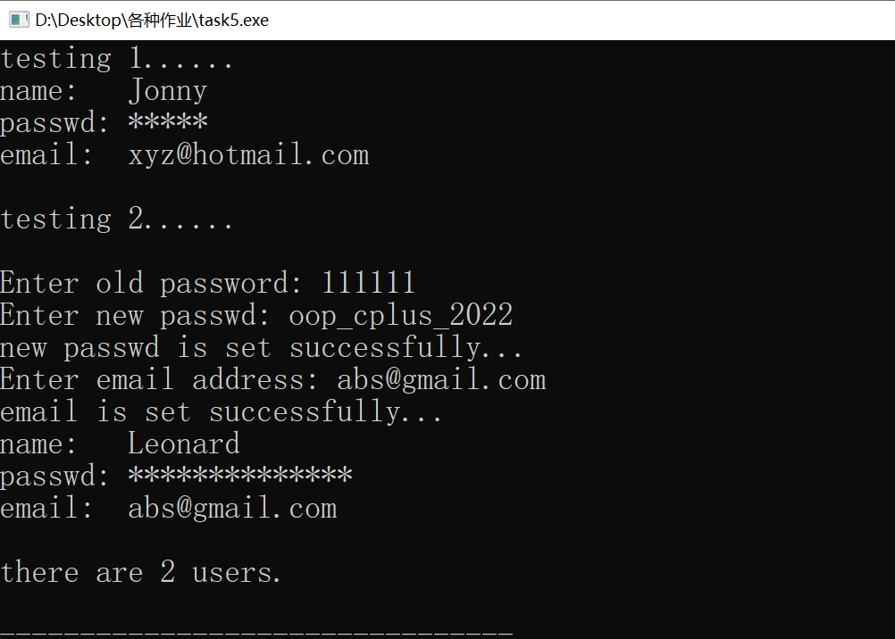 #include<iostream> #include<string> using namespace std; class User{ public: User (string Name, string Passwd = "111111", string Email = "") : name{Name} , passwd{Passwd}, email{Email} {n ++; } void set_email(){ cout << ("Enter email address: "); cin >> email; puts("email is set successfully..."); } void change_passwd(){ string Passwd; cout << ("Enter old password: "); cin >> Passwd; for(int wrong = 1; wrong <= 2 && Passwd != passwd; wrong ++){ cout <<("password input error. Please re-enter again: "); cin >> Passwd; } if(Passwd == passwd){ cout << "Enter new passwd: "; cin >> passwd; puts("new passwd is set successfully..."); } else puts("password input error. Please try after a while."); } void print_info(){ cout << "name: " << name << "\n"; cout <<"passwd: "; for(int i = 0; passwd[i]; i ++) cout << "*"; cout << "\n"; cout << "email: " << email << "\n"; } static void print_n(){ cout << "there are " << n << " users.\n"; } private: string name, passwd, email; static int n; }; int User::n = 0;