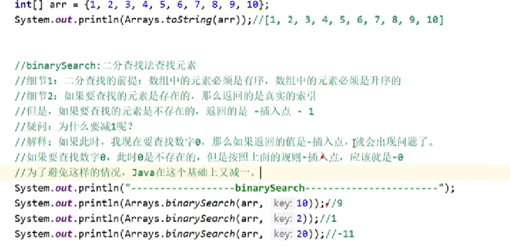 - 二分查找方法的细节1:数组中的元素必须是有序的,并且是升序的