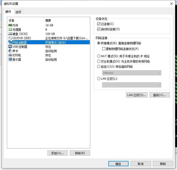 3、创建CentOS-7的虚拟机服务器,网络适配性选择”桥接模式“(即将主机作为交换机的一种网络连接模式)