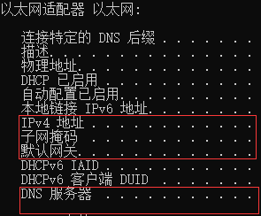 输入ipconfig /all查看所有的配置信息,记录如下参数