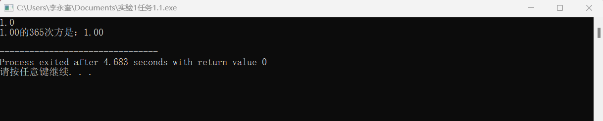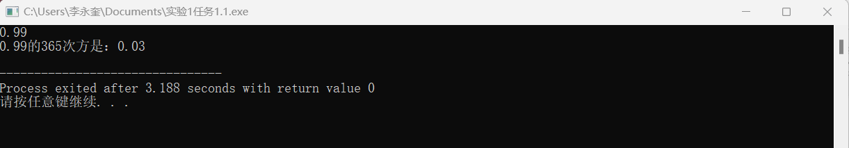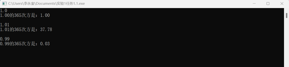 1 #include<stdio.h> 2 #include<math.h> 3 int main() 4 { 5 double x,ans; 6 scanf("%lf",&x); 7 ans = pow(x,365); 8 printf("%.2f的365次方是:%.2f\n",x,ans); 9 10 return 0; 11 }