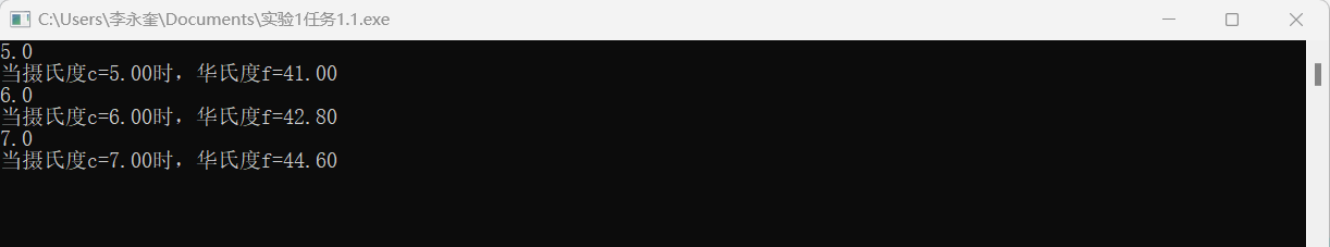 1 #include<stdio.h> 2 #include<math.h> 3 int main() 4 { 5 double C,F; 6 while(scanf("%lf",&C) != EOF) 7 { 8 F=C*9/5+32; 9 printf("当摄氏度c=%.2f时,华氏度f=%.2f",C,F); 10 printf("\n"); 11 12 } 13 14 return 0; 15 }