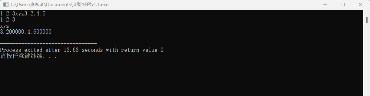1 #include<stdio.h> 2 int main() 3 { 4 double x,y; 5 char c1,c2,c3; 6 int a1,a2,a3; 7 scanf("%d%d%d",&a1,&a2,&a3); 8 printf("%d,%d,%d\n",a1,a2,a3); 9 scanf("%c%c%c",&c1,&c2,&c3); 10 printf("%c%c%c\n",c1,c2,c3); 11 scanf("%lf,%lf",&x,&y); 12 printf("%lf,%lf\n",x,y); 13 14 return 0; 15 }