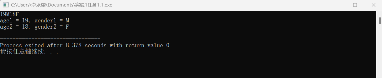 1 #include<stdio.h> 2 int main() 3 { 4 int age1, age2; 5 char gender1, gender2; 6 scanf("%d%c%d%c", &age1, &gender1, &age2, &gender2); 7 printf("age1 = %d, gender1 = %c\n", age1, gender1); 8 printf("age2 = %d, gender2 = %c\n", age2, gender2); 9 10 return 0; 11 }