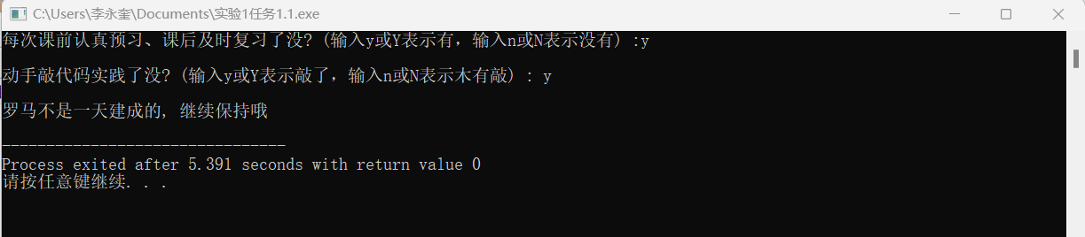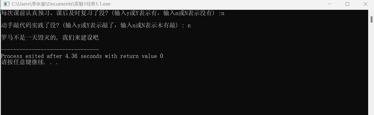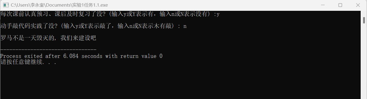 1 #include<stdio.h> 2 int main() 3 { 4 char ans1, ans2; 5 printf("每次课前认真预习、课后及时复习了没? (输入y或Y表示有,输入n或N表示没有) :"); 6 ans1 = getchar(); 7 getchar(); 8 printf("\n动手敲代码实践了没? (输入y或Y表示敲了,输入n或N表示木有敲) : "); 9 ans2 = getchar(); 10 if((ans1=='y'||ans1=='Y')&&(ans2=='y'||ans2=='Y')) 11 printf("\n罗马不是一天建成的, 继续保持哦\n"); 12 else 13 { 14 printf("\n罗马不是一天毁灭的, 我们来建设吧\n"); 15 } 16 return 0; 17 }