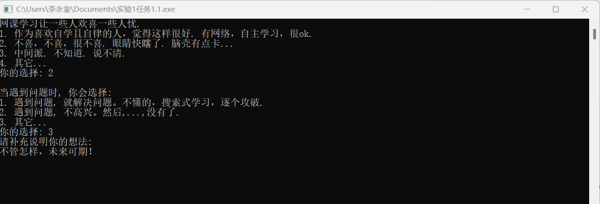 1 #include<stdio.h> 2 int main() 3 { 4 int answer; 5 char words[5000]; 6 printf("网课学习让一些人欢喜一些人忧.\n"); 7 printf("1. 作为喜欢自学且自律的人,觉得这样很好. 有网络,自主学习,很ok.\n"); 8 printf("2. 不喜,不喜,很不喜. 眼睛快瞎了. 脑壳有点卡...\n"); 9 printf("3. 中间派. 不知道. 说不清.\n"); 10 printf("4. 其它...\n"); 11 printf("你的选择: "); 12 scanf("%d", &answer); 13 if(answer == 4) 14 { 15 printf("请补充说明你的想法: \n"); 16 getchar(); 17 gets(words); 18 } 19 printf("\n"); 20 printf("当遇到问题时, 你会选择:\n"); 21 printf("1. 遇到问题, 就解决问题。不懂的,搜索式学习,逐个攻破.\n"); 22 printf("2. 遇到问题, 不高兴。然后,...,没有了.\n"); 23 printf("3. 其它...\n"); 24 printf("你的选择: "); 25 scanf("%d", &answer); 26 if(answer == 1) 27 printf(":)\n"); 28 else if(answer == 2) 29 printf("这样不能解决问题啊...我们选择1好不好:)\n"); 30 else if(answer == 3) 31 { 32 printf("请补充说明你的想法: \n"); 33 getchar(); 34 gets(words); 35 } 36 return 0; 37 }
