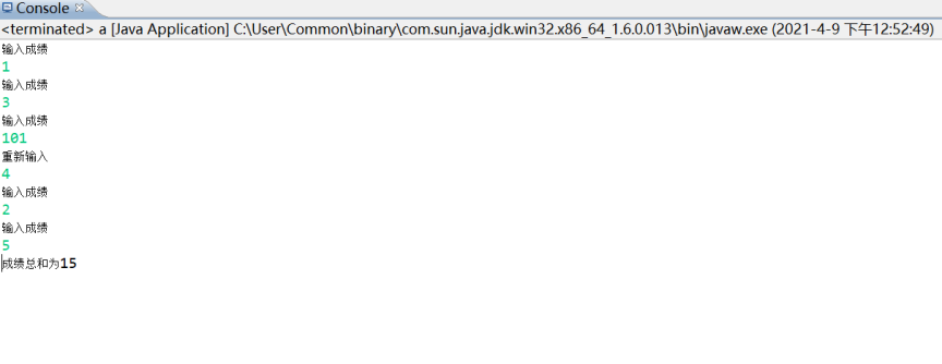 输入5个学生成绩,求和,当输入不合法时,提示输入错误重新输入