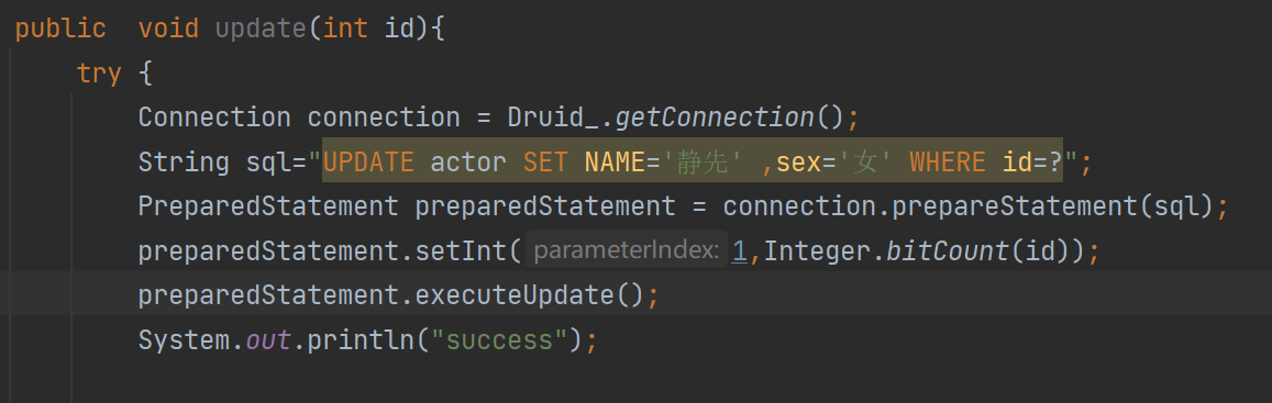 但是返回失败了,update语句执行失败,如果将Integer.bitConnt(id)改为具体id值又会成功,