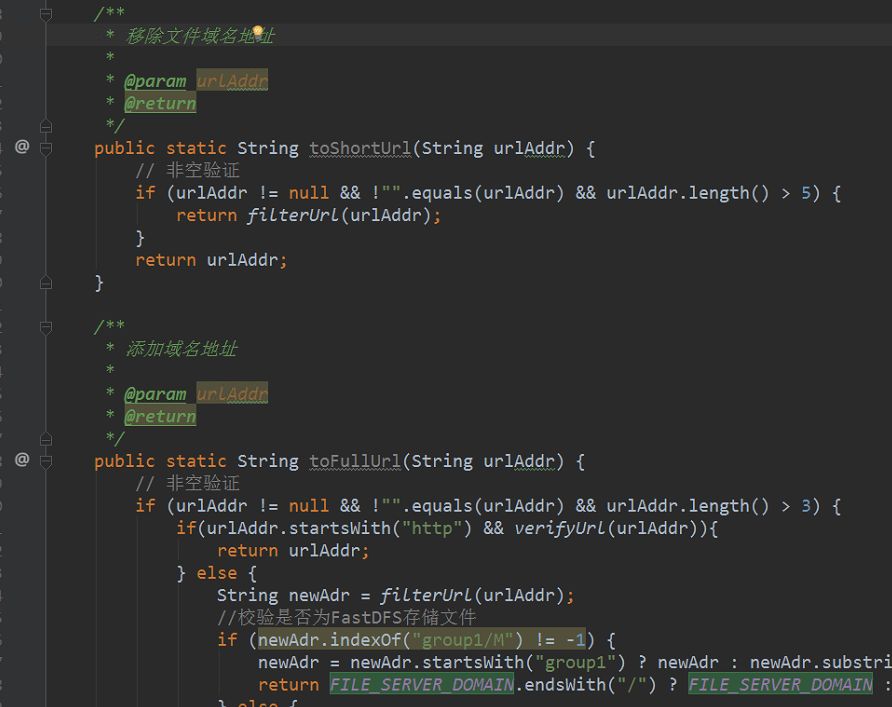 分布式文件服务已经实现,接下来你就可以上传文件实现你的业务代码了。那么文件的路径在数据库怎么存储呢?实际这个有经验的开发者基本都知道,文件路径存入数据库时要去掉域名,在接口查询出来又需要补全域名。为什么这样做呢?在我们的生产环境,一般文件肯定是带域名访问,比如我配的是http域名,但使用小程序后,分享时图片无法使用(不支持http域名下载),必须要用https才可正常使用,那我是不是得改文件访问域名呢。如果你把带域名的文件路径存到了数据库,那么是不是查出来的路劲无法访问了。所以,存储时去域名查询加域名这看似麻烦的操作,但在实际项目中更有利于日过的扩展和维护。编写的文件工具类: