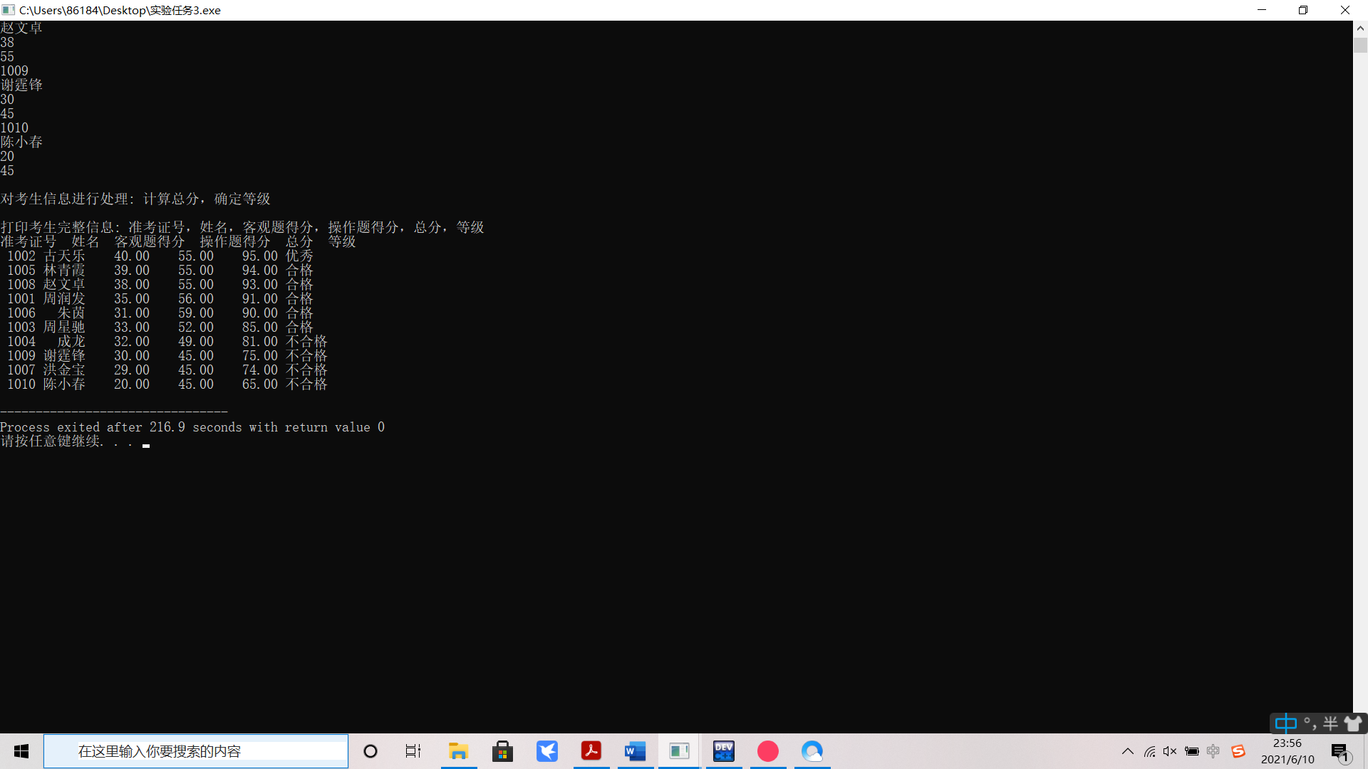 //输出考生完整信息: 准考证号,姓名,客观题得分,操作题得分,总分,等级