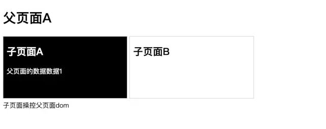 接下来我们来解决子页面和子页面通信的问题,其实方法在上面已经提到了,我们可以把父页面作为一个桥梁,子页面A通过parent.window拿到父页面的window,进而可以获取另一个子页面B的dom,这样我们就可以让子页面A操作子页面B了,反之也是一样的。