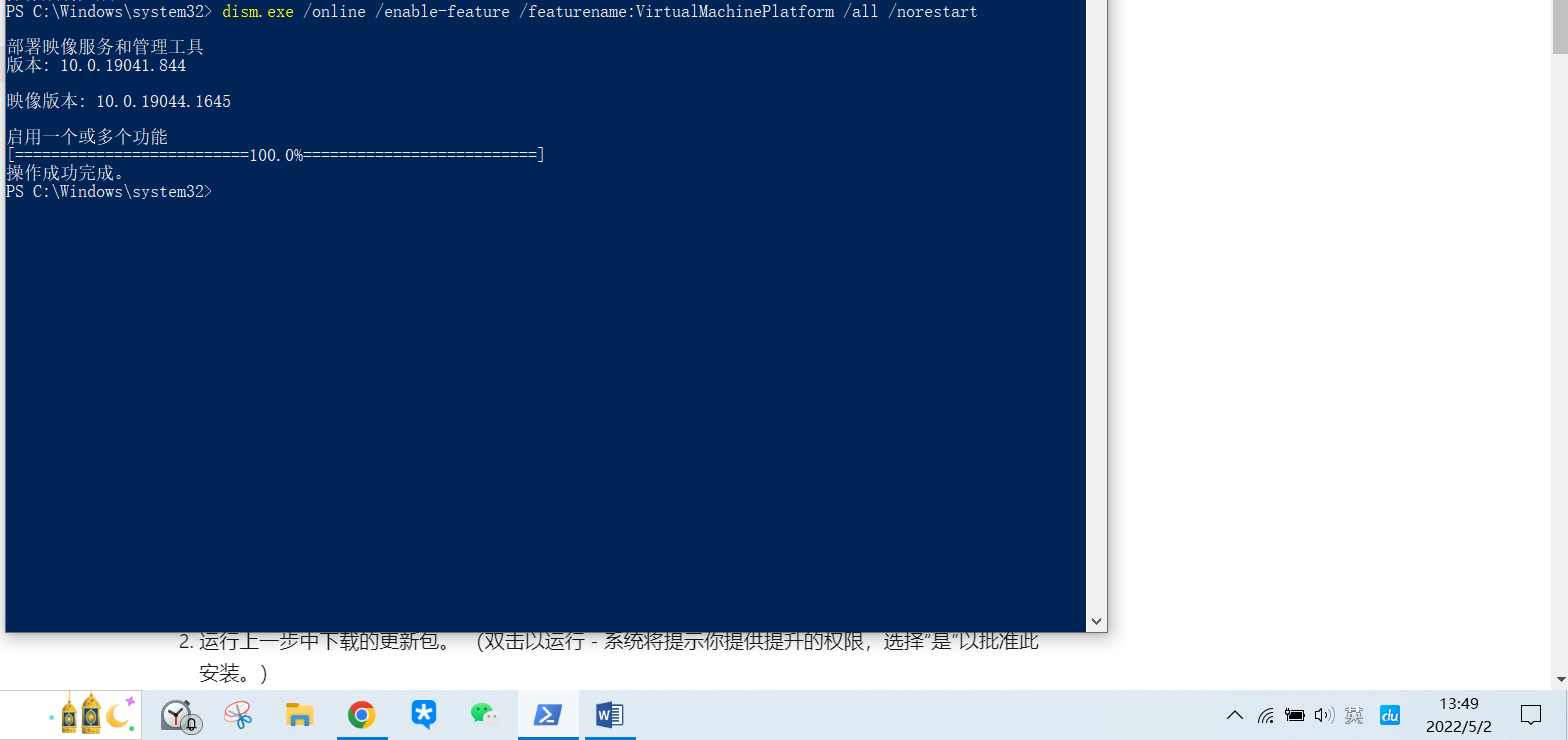 dism.exe /online /enable-feature /featurename:VirtualMachinePlatform /all /norestart