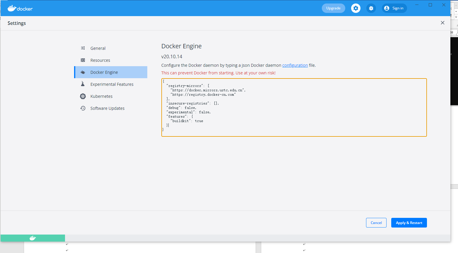 { "registry-mirrors": [ "https://docker.mirrors.ustc.edu.cn", "https://registry.docker-cn.com" ], "insecure-registries": [], "debug": false, "experimental": false, "features": { "buildkit": true } }